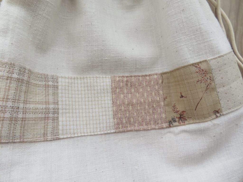 手紡ぎの糸で織られた布にシンプルなパッチワーク。