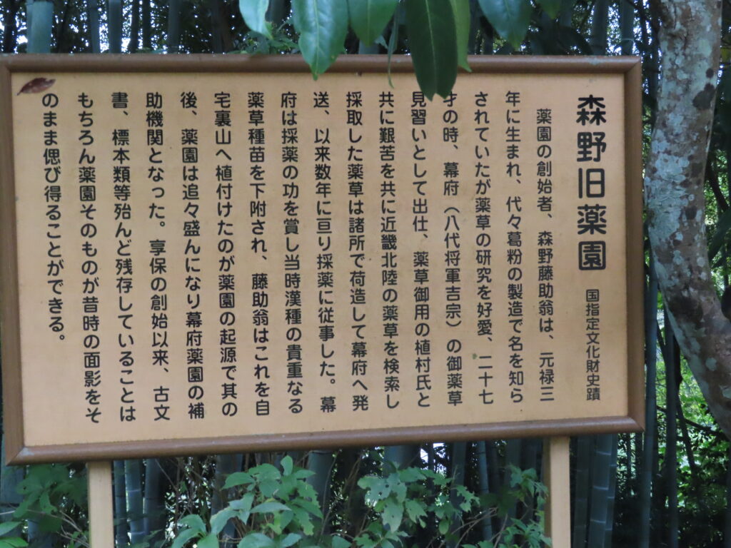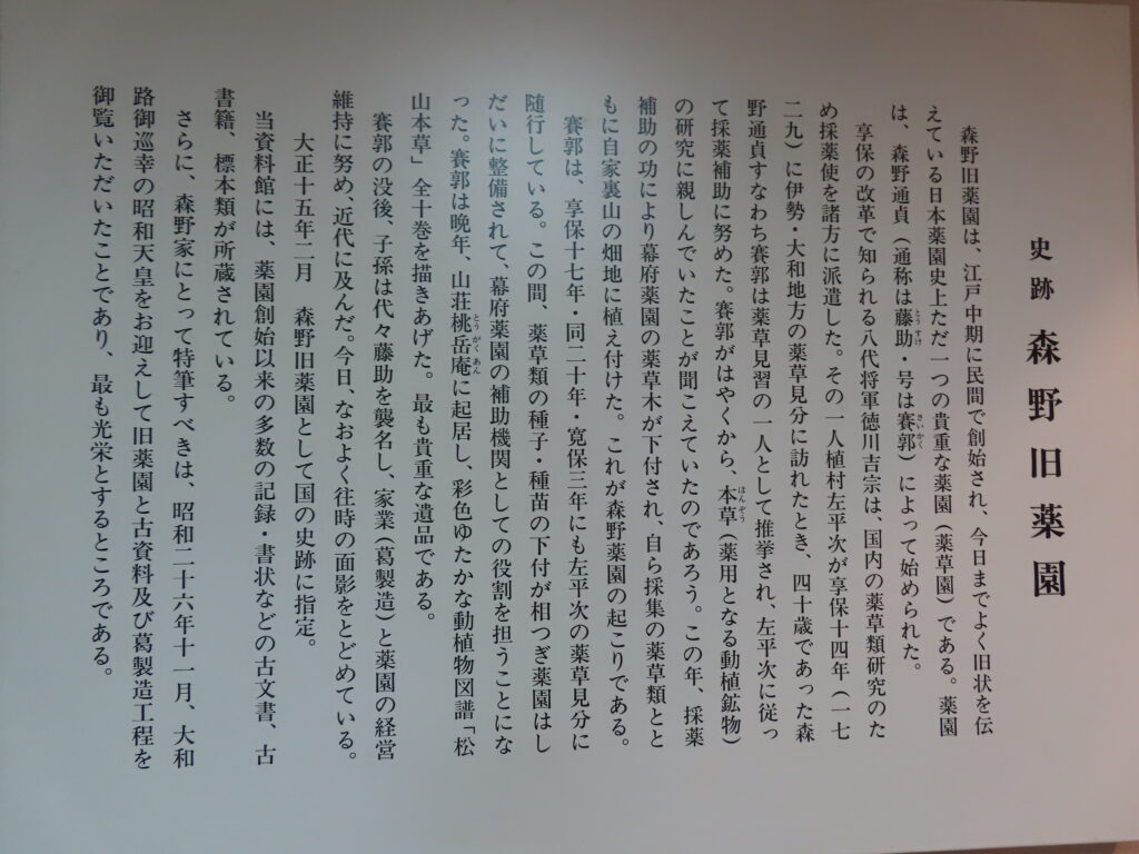 そのことが幕府にも聞こえ、幕府採薬使とともに近畿北陸の薬草を採取したり、幕府より中国産の薬草を下付されたりし、それらを植え付けたことから1729年に当時唯一の私園として、森野薬園が開設されたそうです。