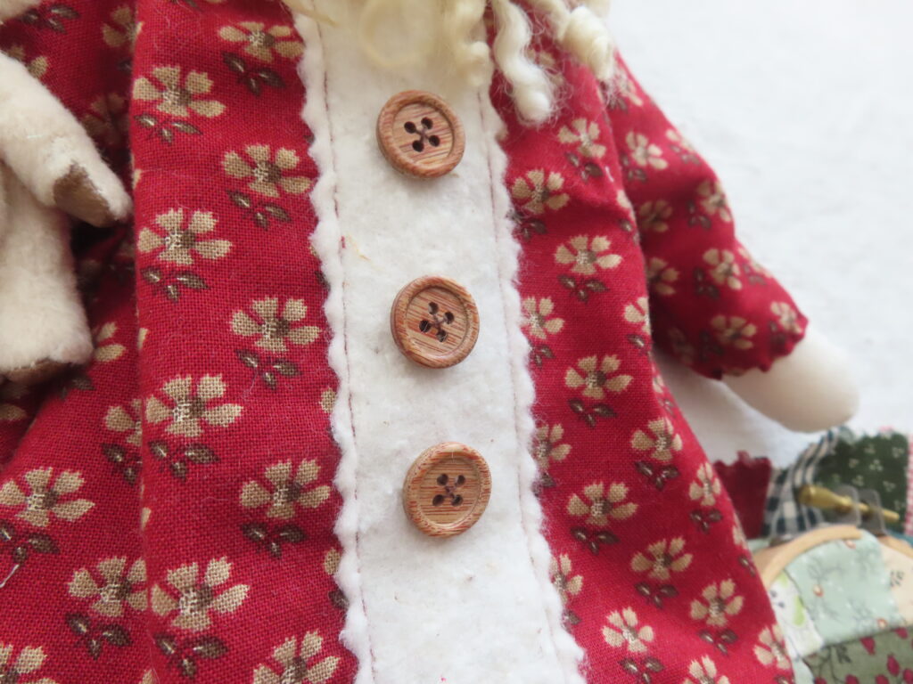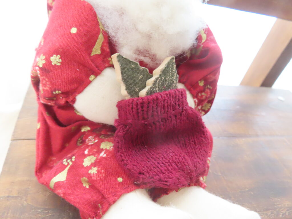 手には小さなモミの木がふたつ。木製パーツに布を貼って作っております。