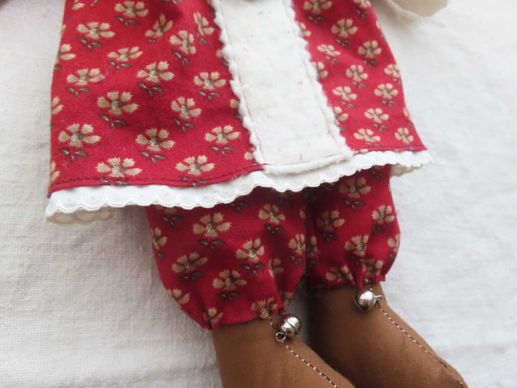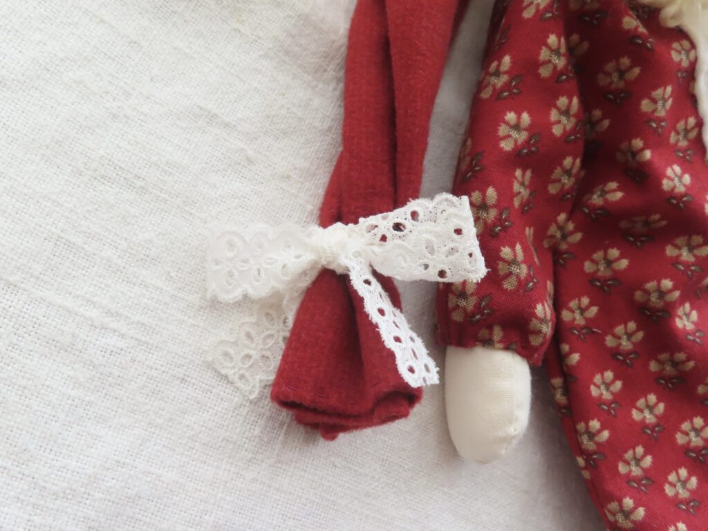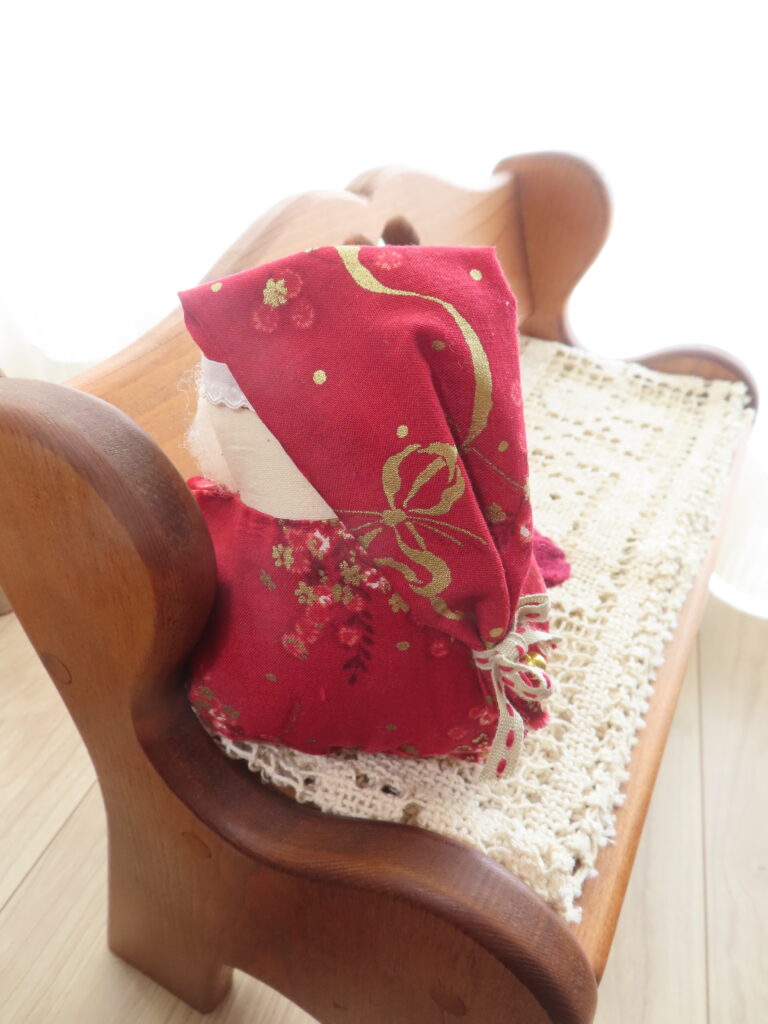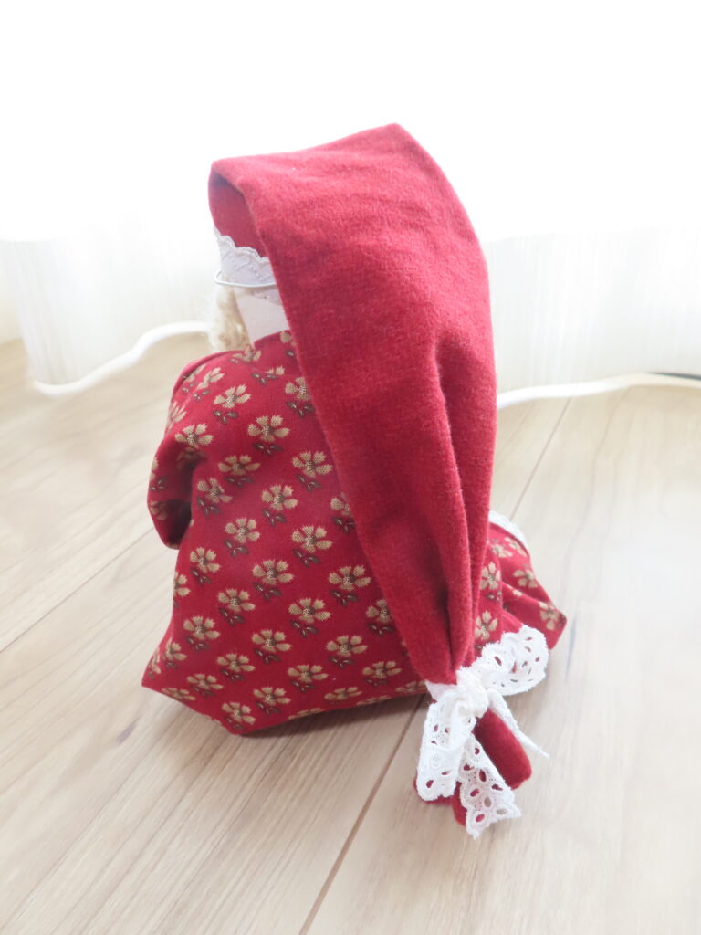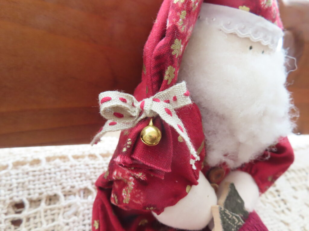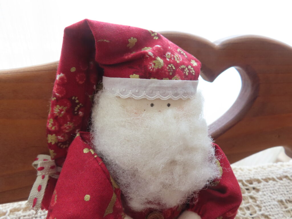 赤に金色が入っているのが品よく、かわいいサンタさん。