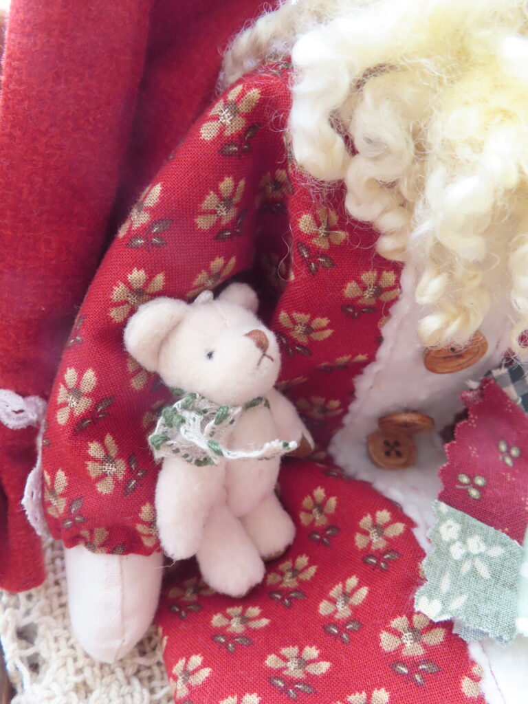 手にはくまのぬいぐるみと、クリスマスらしい色合いのキルト。