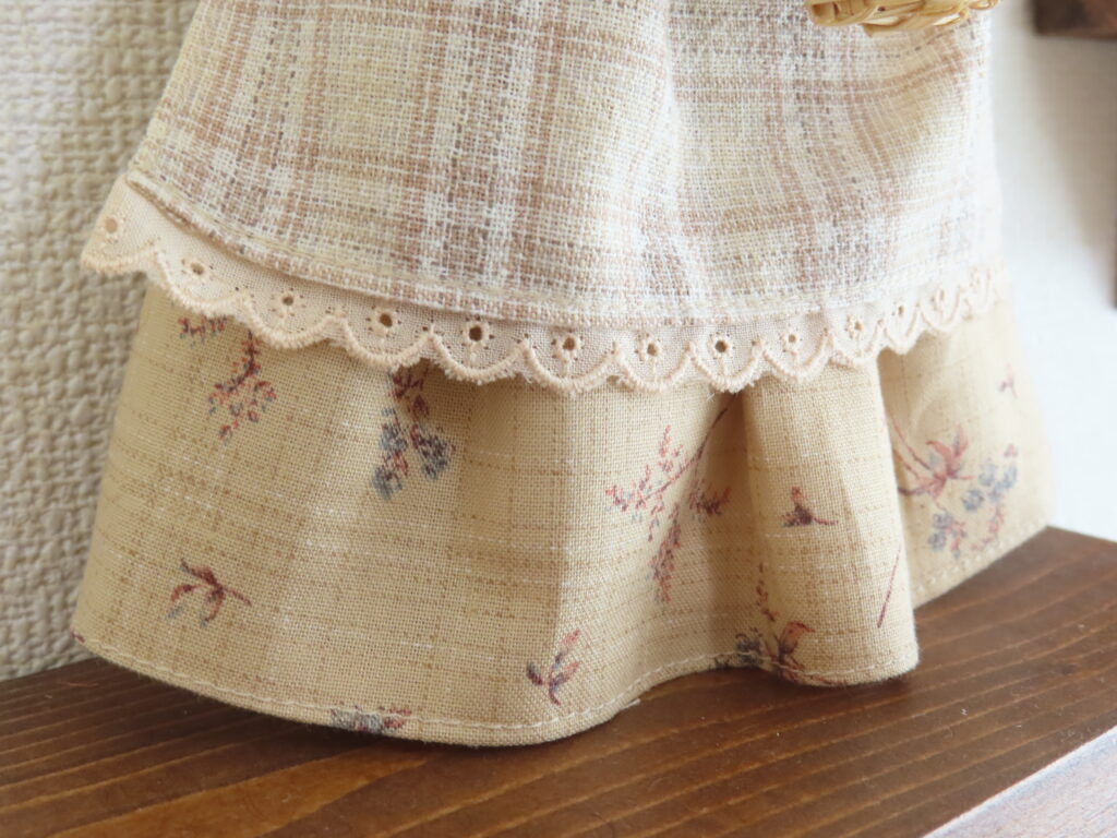 やさしい雰囲気の花柄のワンピースにチェックのエプロン。