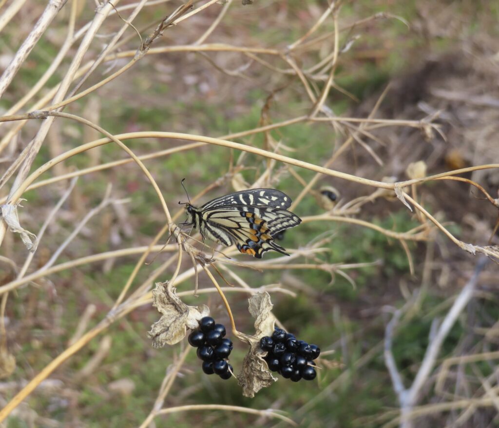 植え付けた後、庭を見て回っていると、アゲハ蝶が羽化して羽を乾かしているところに遭遇。